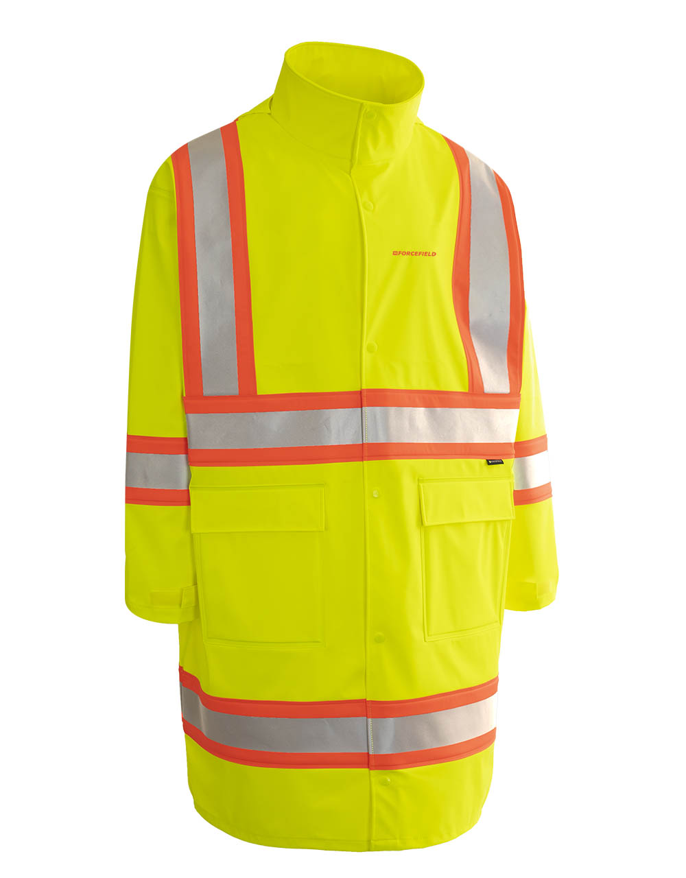 Restez visible et au sec grâce à des bandes réfléchissantes thermocollées de 10 cm et un brassard 360°. Ce vêtement imperméable est doté de coutures thermosoudées, d'aisselles aérées, de poignets réglables, d'une capuche escamotable, de boutons-pression en plastique à l'avant et de deux poches à rabat pratiques sur le devant. Idéal pour les activités de plein air.