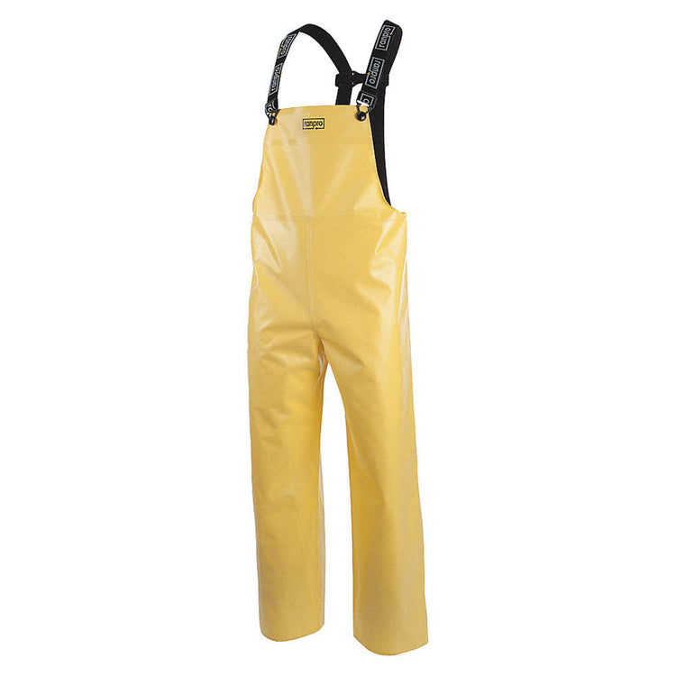 Le pantalon Rainshield(R) extra large est fabriqué en PVC durable sur nylon. Caractéristiques : bretelles élastiques réglables de 1-1/4 pouces avec glissières en nylon et barre d'écartement. Les jambes spacieuses s'enfilent facilement par-dessus les bottes de travail. Bavette double épaisseur pour plus de durabilité.