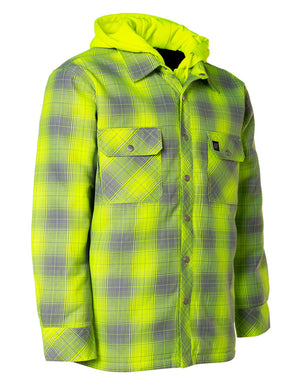 Hi Vis Grey Shadow Plaid Hooded Quilt-Lined Flannel Shirt Jacket