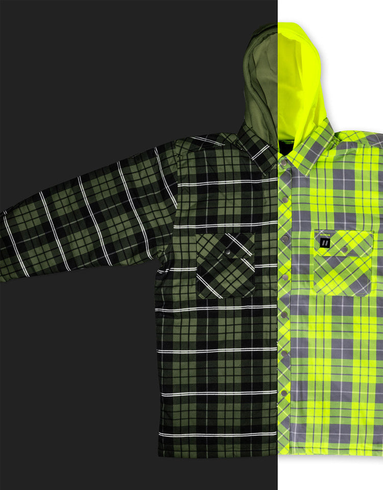 Hi Vis Plaid Hooded Quilted Flannel Shirt Jacket with Reflective Striping