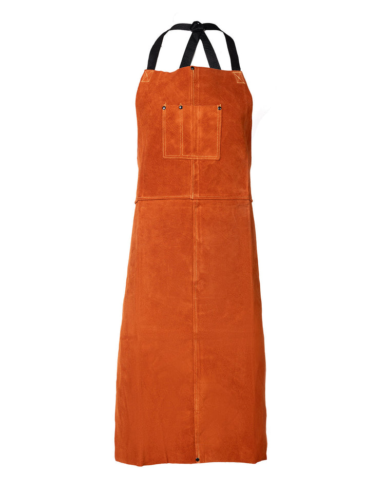 Durable 36"x45" Welding Bib Apron, made from brown cowhide split leather, features two chest pockets for convenience. Its universal size with adjustable chest and waist straps, coupled with a buckle closure, ensures a secure, comfortable fit for all-day protection.