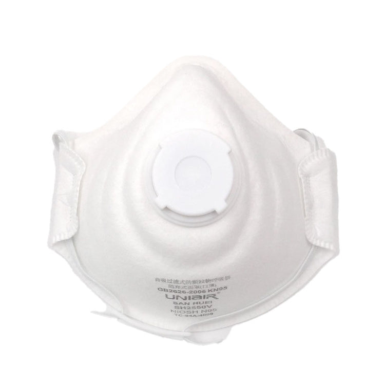 UNIAIR SH2550V with valve is NIOSH Approved N95 masks for at least 95 percent filtration efficiency against certain non-oil based particles such as those from Grinding, Sanding, Sweeping, Sewing, Bagging, or Processing Minerals, Coal, Iron, Ore, Flour, Metal, Wood, and certain other substances. Different from most of the N95 masks, its’ patented buckle allows adjusting the length of the head strap for various facial sizes. Continuous loop design can allow to hang the mask around the neck when not in use. No metal used is suitable for those environments where metal is not allowed. Meet NIOSH 95 and GB2626-2006 standards both. Got China LA approval to use as personal protection equipment for workers.